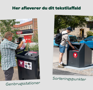 Man kan aflevere tekstilaffaldet på genbrugsstationen [tilføj gerne navn på jeres nærmeste genbrugsstation] eller i et sorteringspunkt i en pose med knude på. Husk, at det skal være rent og tørt.